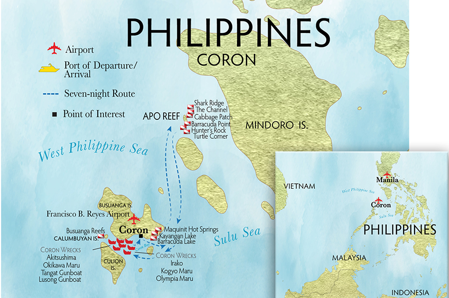 Die Reise umfasst auch Tauchgänge im Apo Reef Natural Park, dem größten Korallenriffsystem der Philippinen und dem zweitgrößten zusammenhängenden Korallenriffsystem der Welt nach dem Great Barrier Reef in Australien. Das vor Occidental Mindoro gelegene Apo Reef ist ein geschützter Hotspot der Artenvielfalt mit ausgedehnten Riffen, tiefen Kanälen und außergewöhnlichen Korallen und Meereslebewesen. Das Gebiet gilt weithin als erstklassiges Tauchziel und potenzielles UNESCO-Weltkulturerbe.